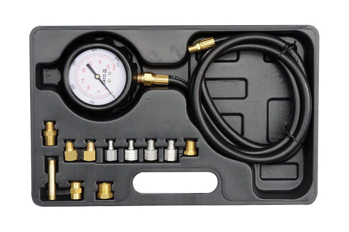 Тестер позволяет произвести диагностику масляного насоса, датчиков давления и пр. Набор укомплектован высокоточным манометром, в комплект входят 11 адаптеров с различными резьбами.